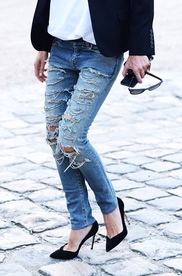 First of all, decide on the denim style you want to choose for. You can choose from Straight fit, Boot cut Fit, Bell Bottoms, Boyfriend Fit, Straight Fit, Skinny Fit etc. Then decide how much ripped you want your denim to be. You can either choose for different brands, or create your own torn out effect on any old denim of yours.