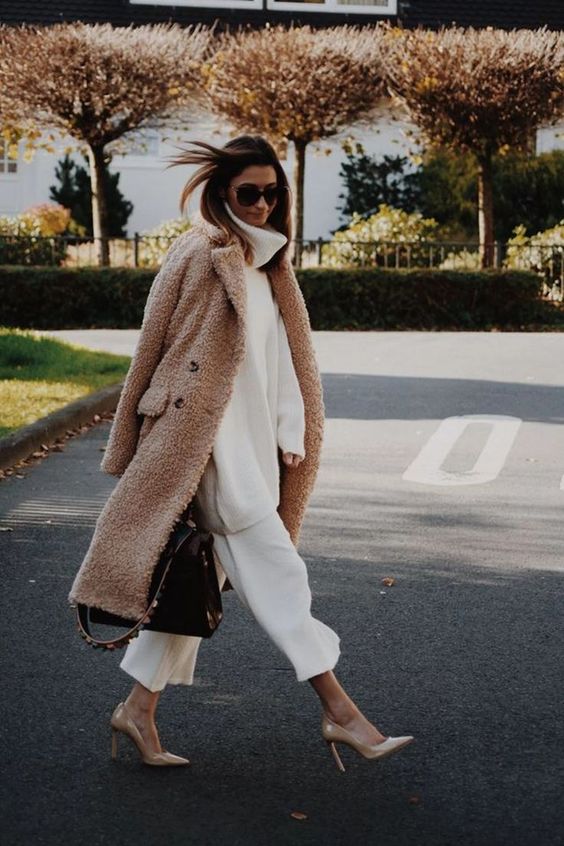Monochrome outfit– You can also choose to wear a single color outfit with your teddy sweater, as the monochrome concept really makes the teddy sweater to stand out. So wear it with a single color winter dress, or pair it with a single color top and bottom.