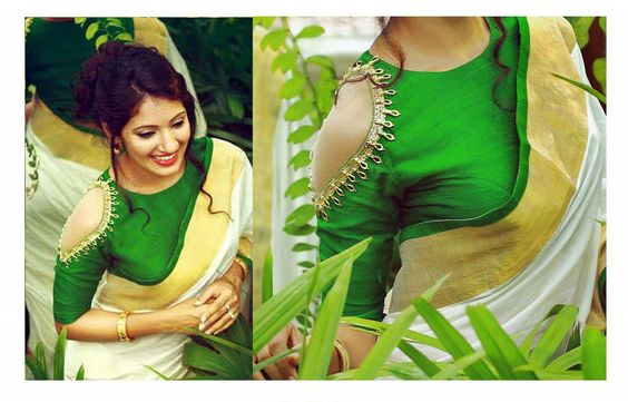 Puff sleeves– To add a retro look to your saree blouse look choose a puff sleeve blouse. Delicate frill or tassel details on the neckline and sleeves will make the whole blouse look super feminine.