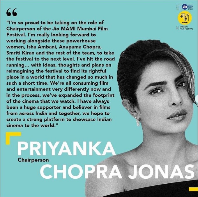 Priyanka Chopra Jonas who recently took over the position of chairperson of the Jio Mami Mumbai Film Festival took to her Instagram account to share her views and planning project about the future of Indian cinema.