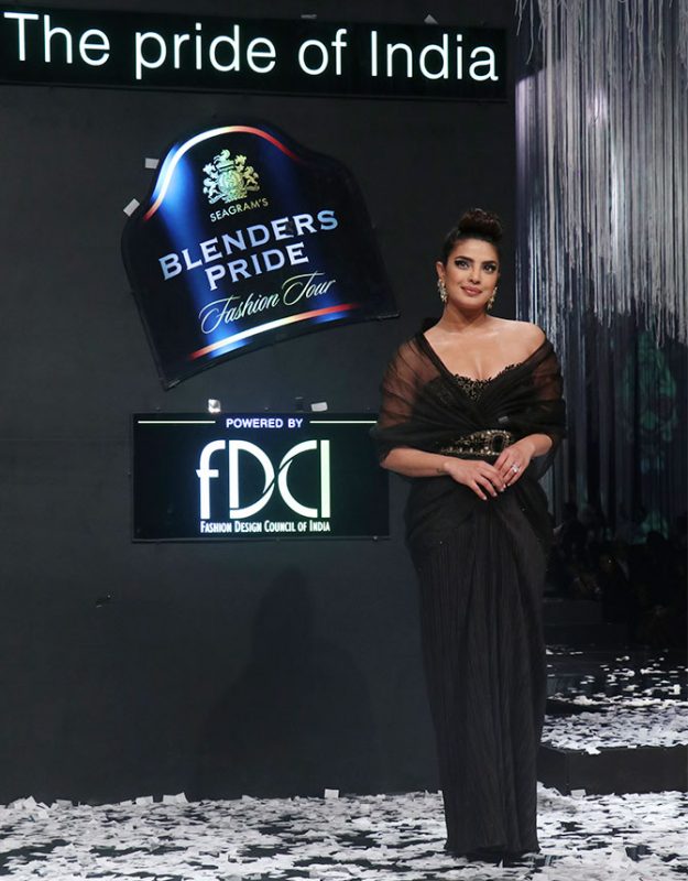 Priyanka Chopra recently kick started the 15th edition of Blenders Pride Fashion Tour by walking the ramp for the event. Priyanka who is also the brand representative for Blenders Pride, looked stunning in an off shoulder black saree gown which had a sheer drape around the shoulders. She accessorized her look with a broad ornamented belt at the waist, and wore bold statement earrings with winged eyeliner and retro hairstyle.