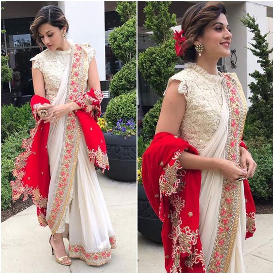 Saree with a dupatta-Though double palla is in fashion but this saree style shows you that you can wear your saree with an embroidered dupatta as well. Taapsee is wearing an embroidered saree with a pair of fitted trouser and a long length top with frill at the neckline. The contrast color embroidered dupatta adds an elegant look to the attire.
