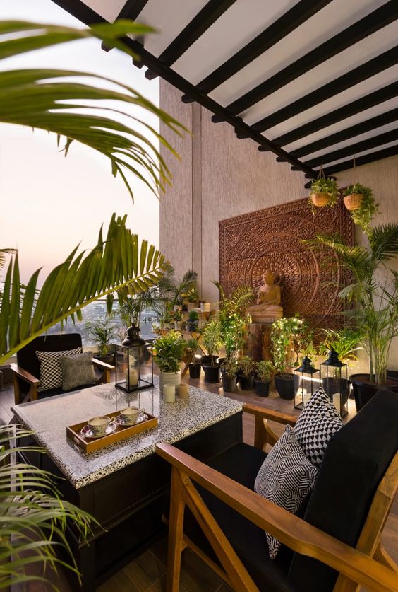 Buddha for calmness– Though the picture shows a balcony setup but we bet that this idea can be well adopted for an entrance setting. Use an attractive background to decorate the wall behind the statue, like you can use a large mirror or wooden pallets or even a wallpaper. Keep Buddha statue on a raised platform and surround it with plants in different sizes and shapes. Some huge candle stands and fairy lights will light up the entire ambience.