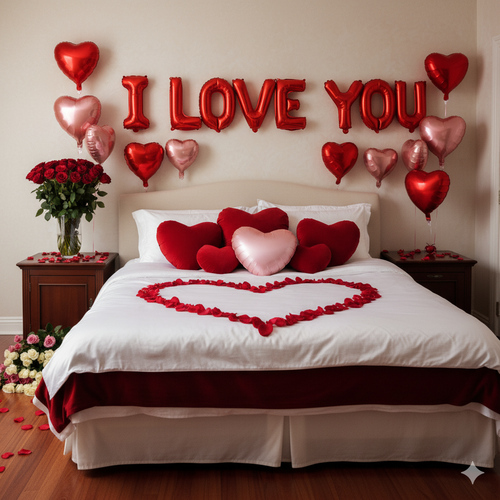 Bedroom decor– Helium balloons in shades of pink and reds would be perfect for this decor and do use lots and lots of them. You can also use a separate sheet to create a heart like pattern on the bed. Use candles on the floor and fairy lights to lit up the room. You can also place a few photographs from your early days to make the ambience more romantic.