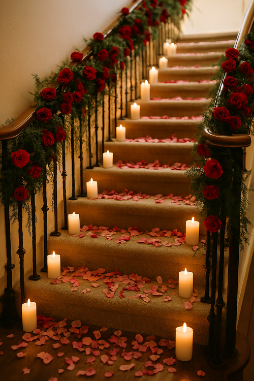 Go dramatic– What a wonderful decor this is! Decorate your railing with lots and lots of roses and place candles on each stairs to make the set up look pleasing. Do not forget to sprinkle rose petals all around the candles. You can also do this set up on a plain floor, just skip the railing decor and go with the candles and sprinkle of flowers.