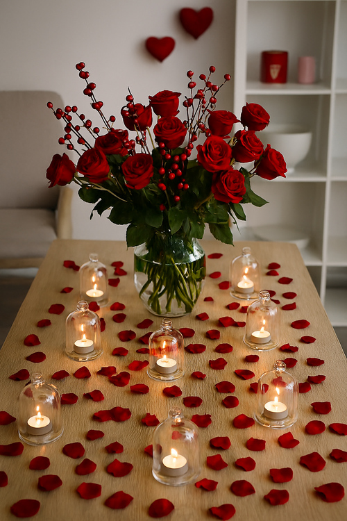 Table decor– Pick up any table to decorate it specifically for Valentine’s day. All you need is a flower vase, some candles in different sizes and a few fresh flowers. Decorate the corner in red theme choosing all the things in red. To break the monotony of the color you can keep a mix of white and red candles.