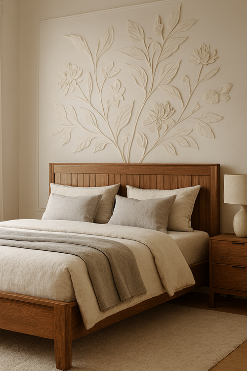 Corner design– If you have a plain grey background or even a raw cemented background then a floral embroidered or hand painted framed canvas can be used to highlight the corner of the wall behind the bed.