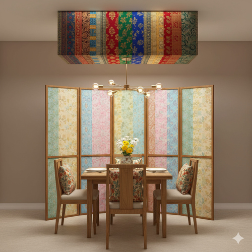 Use it as a decorative panel above dining table– If you feel that the area around your dining table is too plain or quiet, and if you want to add an eye catchy element in this area then this idea is perfect for you. Decide the area you want to cover and get a framed board made with your fabrics and use it with an interesting light to revamp the setting. You can use a single fabric or can even use cuttings of different fabrics to make one single large piece.