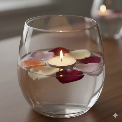 – If you are in a hurry or do not want to add fancy items to the look then just the water and the candle arrangement will do the job. Pick your favorite glasses for the same. You can also use fragrant candles for an aroma or just add few drops of essential oil to the water for a rejuvenating experience.