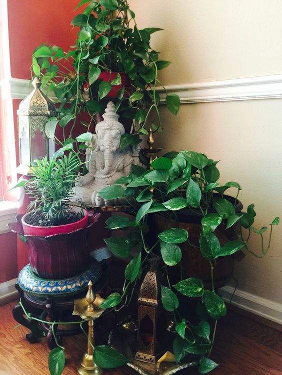Just around the corner– Decorating the corners with indoor plants like money plants, cane bamboo plant can be really interesting. It is something unusual, different and looks great. You can also add a statue of Buddha or Lord Ganesha in middle and keep the plants around it. A few decorative elements like candle hangers or a brass item would look great too.