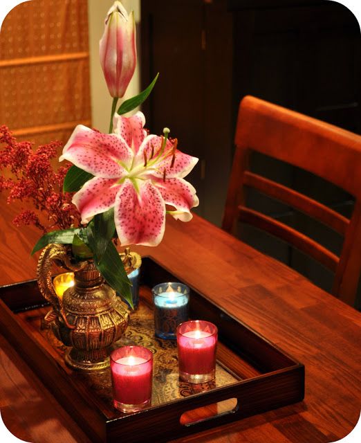 The tray decoration– For the upcoming festivals, this is a perfect decorative idea and is simple too. We all know about tray decoration, so pick up a simple classic tray and decorate it with a pot of flowers and leaves. Keeping few candles will enhance the look.