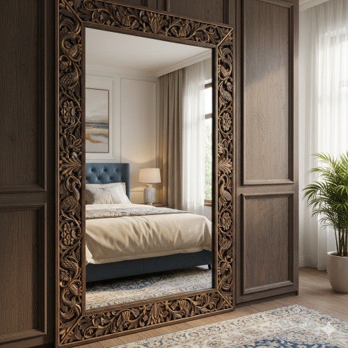 Carved Indian Mirrors– One more interesting element which can be added is experimenting with a vintage carved mirror. In India we get amazingly hand carved mirror frames, which adds an old world charm to the interiors. Put it at the entrance of the home, or pair it with the console table. You can also add it to the balcony decoration ideas.